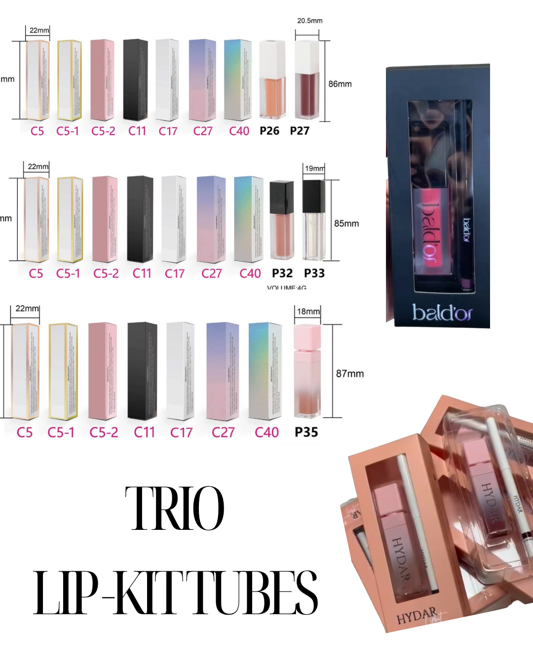 - Choose from 3 gloss tube styles only (shown in photos above) and choose between 4 Box packaging you can also add your logo to the Lip Kit packaging